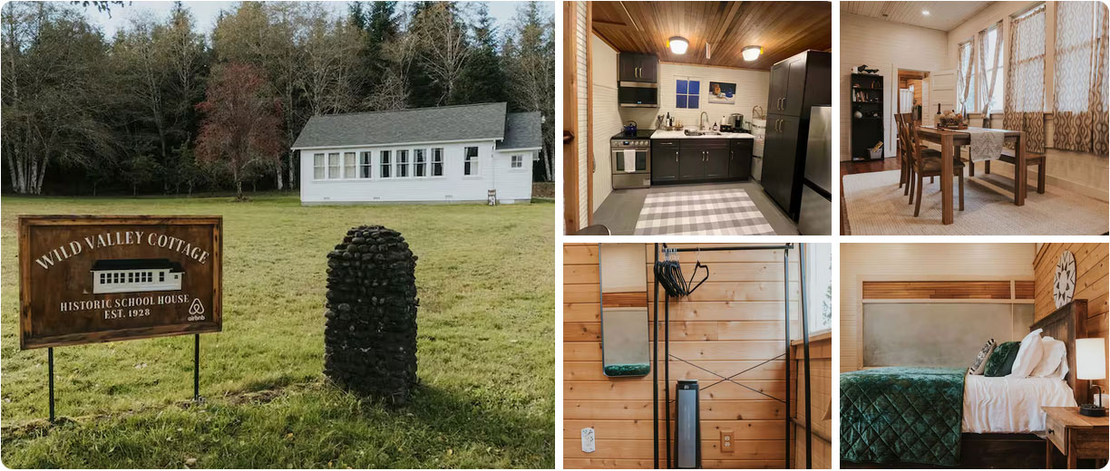 Step back in time to this nationally registered historic, 1928 former schoolhouse! The schoolhouse was converted into a 2 bedroom, 3/4 bathroom cottage with an updated kitchen and bath! Hand-stained refinished old growth fir flooring and original windows that overlook the gorgeous Sol Duc Valley where you will see the Roosevelt elk grazing in the field below! Click to view.