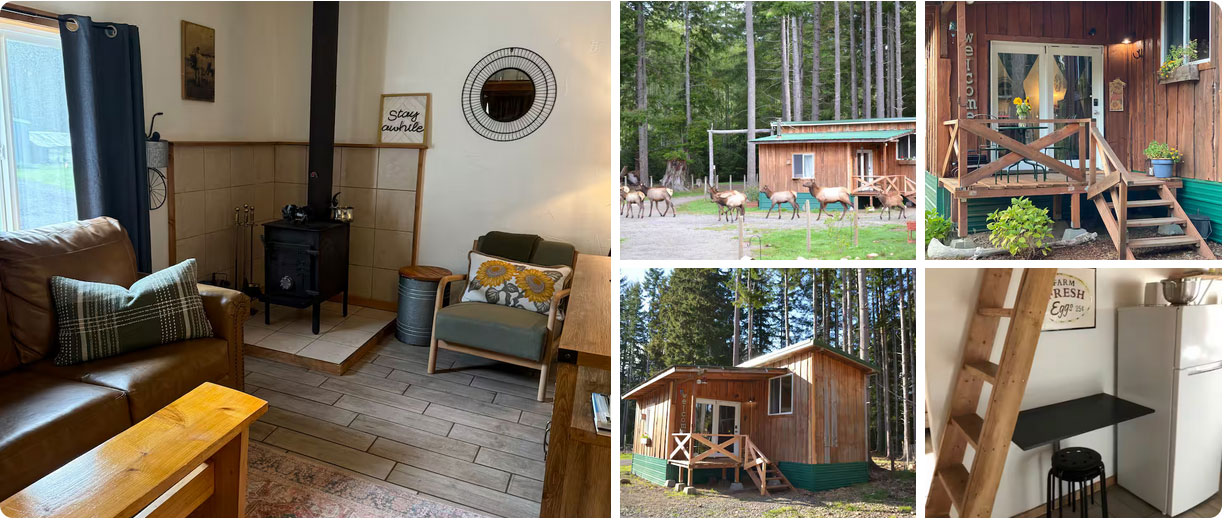 This cozy cabin features a Queen Bed, full shower, and kitchen ideal for a romantic getaway or hiking in the Olympic National Park! The cabin has Starlink high speed internet and smart TV, a propane firepit, and outdoor seating area. Click to view.
